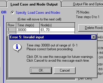 3. On the Load Case and Node Output tab, choose Specify Load Cases and Nodes. In Row 1, enter a Time Step of 30000. You will get a warning message that this time step is beyond the range of the current results 0-1. Click OK. When the New Results file is created, this invalid time step will automatically be adjusted to the last time step in the analysis, as shown in the error log file.