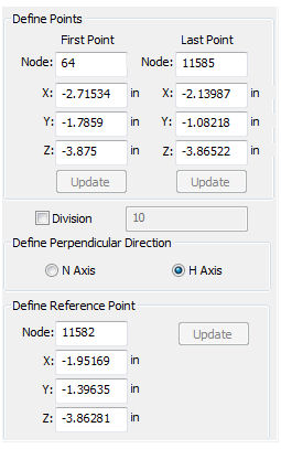 You use the fields and options in the section of the Stress Linearization utility shown below to define the Stress Classification Line (SCL) for your model. In addition, you use these settings to specify the local coordinate system on which the graphed stress tensors are based.