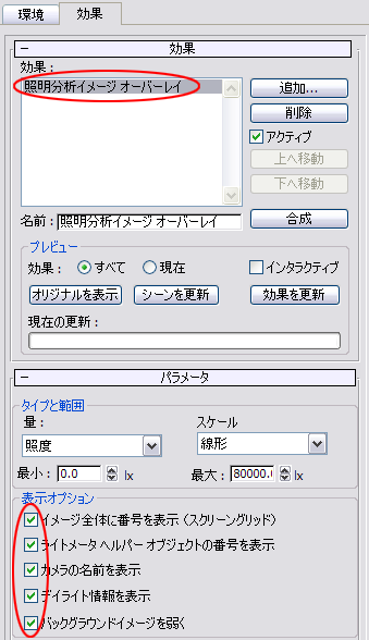 [プレビュー](Preview)領域で[オリジナルを表示](Show Original)をクリックし、照明データなしのシーンを表示します。データを再表示するために、[効果を表示](Show Effects)をクリックします。