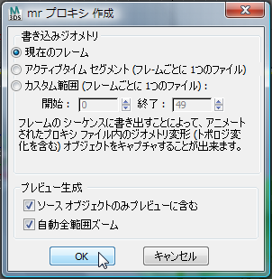 3ds Max によって[mr プロキシ作成](mr Proxy Creation)ダイアログ ボックスが開きます。このダイアログ ボックスで[OK]をクリックして既定値の値を適用します。