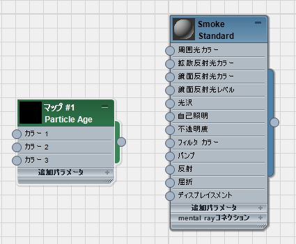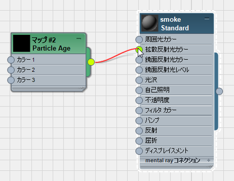 - アクティブ ビューで、パーティクル エージ マップの出力を標準マテリアルの[拡散反射光カラー](Diffuse Color)の入力にワイヤリングします。