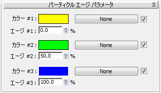 パーティクル エージ マップでは、3 つのカラーを指定します。既定で[カラー #1](Color #1)はパーティクルが発生するとき(0 パーセント)のカラー、[カラー #2](Color #2)はパーティクルが寿命の中間に来たとき(50 パーセント)のカラー、[カラー #3](Color #3)はパーティクルが消滅するとき(100 パーセント)のカラーです。寿命は変更できますが、このチュートリアルでは変更しません。