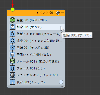 - パーティクル ビューで、Delete オペレータをコンテナからドラッグし、Event 01 の Birth オペレータと Position Icon オペレータの間にドラッグします。