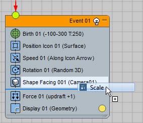- Scale オペレータをコンテナから Event 01 にドラッグし、Shape Facing オペレータと Force オペレータの間にドロップします。