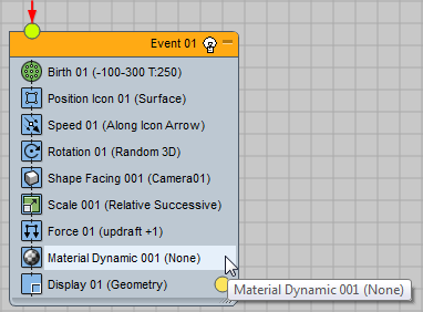 - Material Dynamic オペレータをコンテナからドラッグし、Event 01 の Force オペレータと Display オペレータの間のドラッグします。