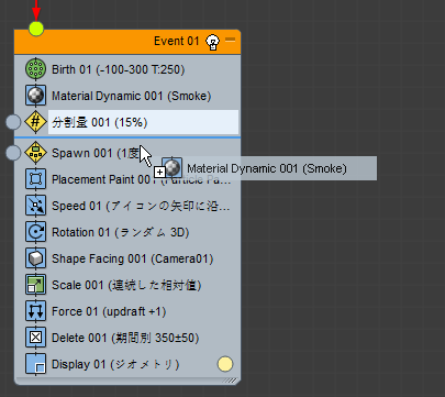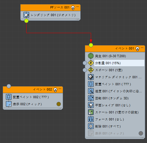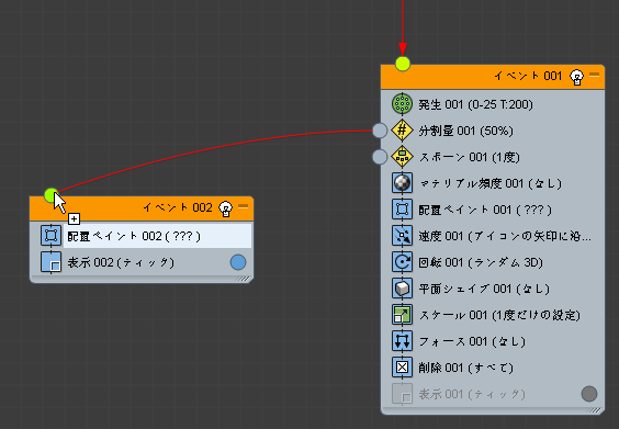 これで Event 002 は、Split Amount から送られるパーティクルを使用できるようになりました。