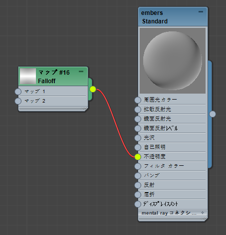 - [フォールオフ](Falloff)マップをブラウザから Embers ビューにドラッグし、Embers マテリアルの[不透明度](Opacity)コンポーネントにワイヤリングします。