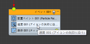 Event 002 は、残り火のパーティクルを生成するソースとして Particle Paint 002 を使用します。