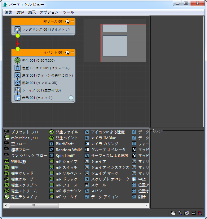 パーティクル ビューは、パーティクル フローシステムのメインのインタフェースです。ここでパーティクルの動作を追加して調整します。ウィンドウのメインの領域は、左上のイベント表示です。ここには既に作成したイベントが表示されます。左下の「コンテナ」には、イベント表示に追加できるオペレータが表示されます。