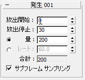 虚数のフレーム -100 から放出を開始するということは、3ds Max にアニメーションが始まる前からパーティクルを生成するように指定することを意味します。そのため、フレーム 0 の時点でシーンには既に煙があります。パーティクルの放出をアニメーションの最後のフレームである 300 で停止するということは、アニメーション全体を通して煙が表示され続けることを意味します。