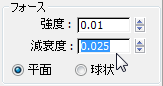 [フォース](Force)領域で、[強度](Strength)を 0.01 に、[減衰度](Decay)を 0.025 に設定します。