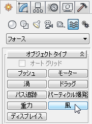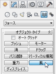 - [オブジェクト タイプ](Object Type)ロールアウトで、[風](Wind)をアクティブにします。