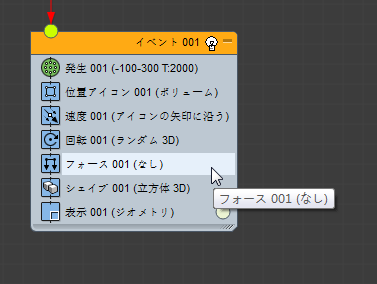 - パーティクル ビューの左下にある「コンテナ」で Force オペレータをクリックしてハイライト表示します。それをイベント表示にドラッグして、Event 01 の Shape オペレータのすぐ上にドロップします。