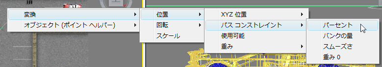 注: あるいは、自動車を直接パスにコンストレイントする方法もあります。ただし、この例ではヘルパーを自動車の親にする方法をお勧めします。その方が、急カーブでのスリップなど、自動車の動きをよりコントロールできます。