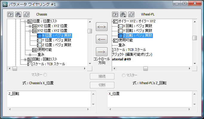 - [パラメータ ワイヤリング](Parameter Wiring)ダイアログ ボックスで、「コントロール方向」という文字列のすぐ上にある右向きの矢印をクリックします。これで、Chassis の Y 位置によって Wheel-FL の Z 回転がコントロールされるようになります。