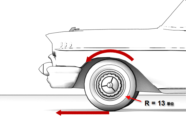 - 円弧の長さを平らにした距離が、自動車と車輪の移動距離になります。