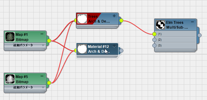 - Trees マテリアル ノードを Elm Trees ノードの (1) サブマテリアル ソケットにワイヤリングします。