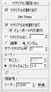 注: [ランダム](Random)オプションは、[サブ-マテリアル #](# Sub-Materials)の値が 1 よりも大きくないと使用できないため、Elm Trees マテリアルをオペレータに割り当てるまでこの設定を選択できません。
