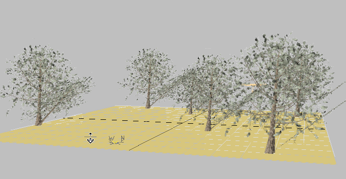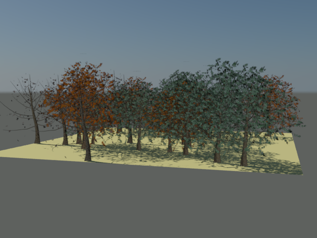 Camera01 ビューポートが更新され、3 つのタイプの木がすべてランダムに選択されて表示されます。