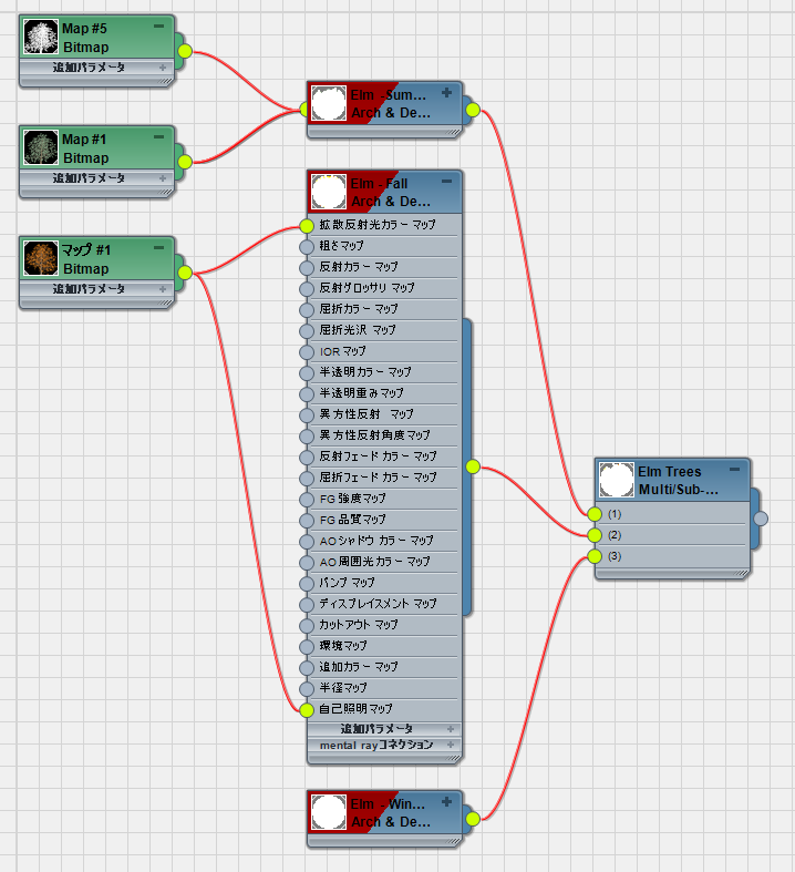 - 2 番目と 3 番目のマテリアル ノードを Elm Trees マテリアル ノードの (2) と (3) のソケットにワイヤリングして、これらもサブマテリアルにします。