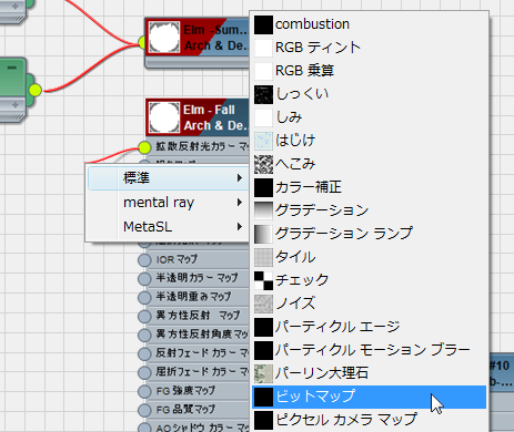 - 新しいビットマップ ノードを Shift を押しながらドラッグしてコピーを作成し、そのコピーを Elm - Fall サブマテリアルの[カットアウト マップ](Cutout Map)ソケットにワイヤリングします。
