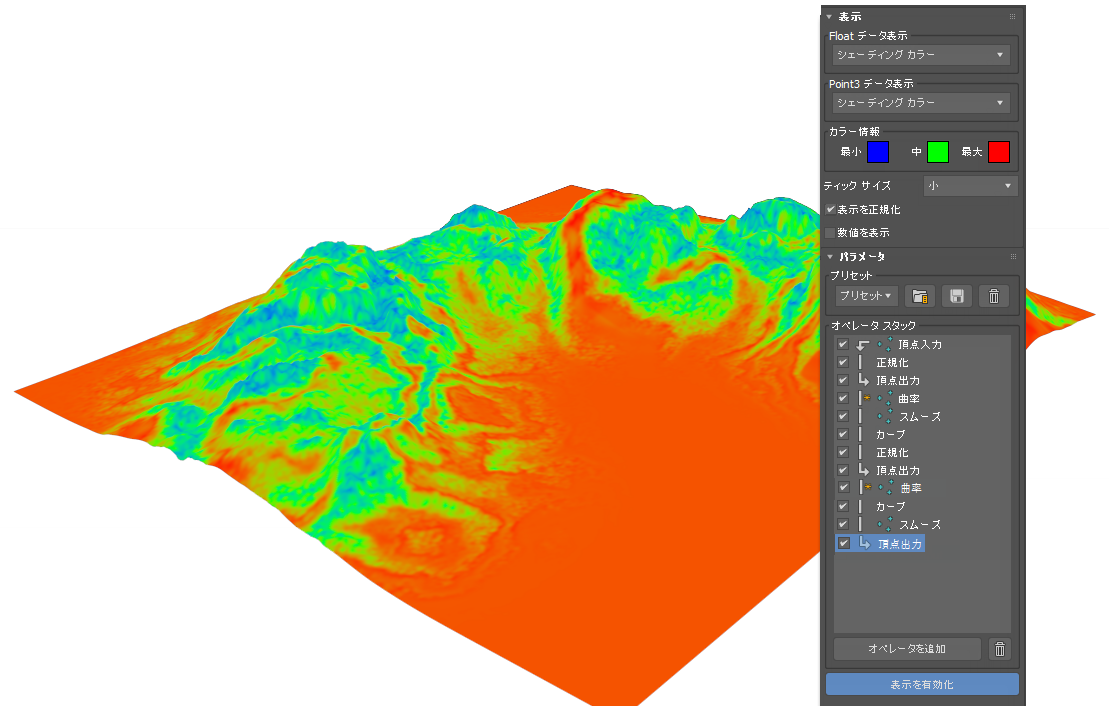 [データ チャネル](Data Channel)モディファイヤを使用して、曲率データで特定の地形機能を特定する例を示します。このプロセス スタックを使用すると、積雪などをリアルに表現するために領域をマスクし、追加のモデリングを行った後に自動的に更新することができます。