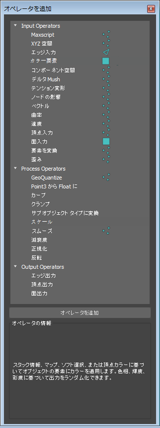スタックに入力、処理、および出力オペレータを追加するには、[オペレータを追加](Add Operator)ダイアログ ボックスを使用します。