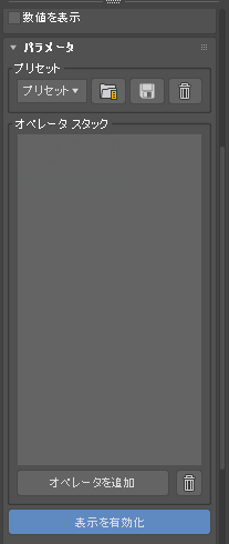 オペレータを追加する、プリセットを保存およびロードする、ビューポート内でデータの視覚的表示を有効化するには、[パラメータ](Parameters)ロールアウトを使用します。