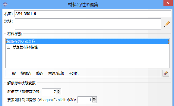 複合材料の場合、入力ファイルの *DEPVAR キーワードでは、パラメータ DELETE の値を 1 に設定する必要があります。以下に例を示します。