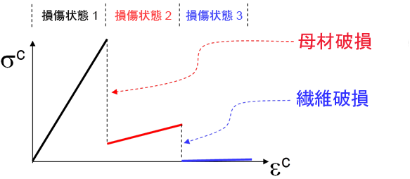 MCT 分解を変更せずに維持して、母材破損後の構成の応力を正確に取得するにはは、微視的から巨視的なスケールまで一貫した関係を保持するために、母材構成の特性も劣化されます。