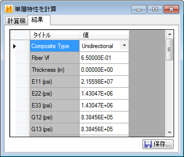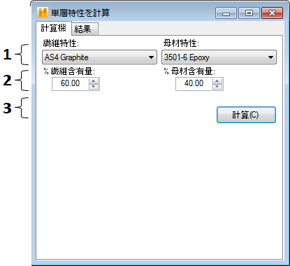 [新しい項目]メニューから[マイクロメカニックスからの新しい単層]オプションを選択すると、下記に示す[単層特性を計算]ウィンドウが表示されます。[単層特性を計算]ウィンドウには、[計算機]と[結果]という 2 つのタブがあります。[計算機]タブは、新しい単層材料を定義するデータを指定するのに使います。[結果]タブは、マイクロメカニックス モジュールで計算された新しい単層材料の特性を表示するのに使われます。[単層特性を計算]ウィンドウに入力するすべてのデータ項目について、以下に説明します。