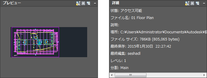 [プレビュー/詳細ペイン]を選択すると、 (プレビュー)をクリックしてプレビューを表示したり、 (詳細)をクリックして選択した図面ファイルの説明を表示したりできます。