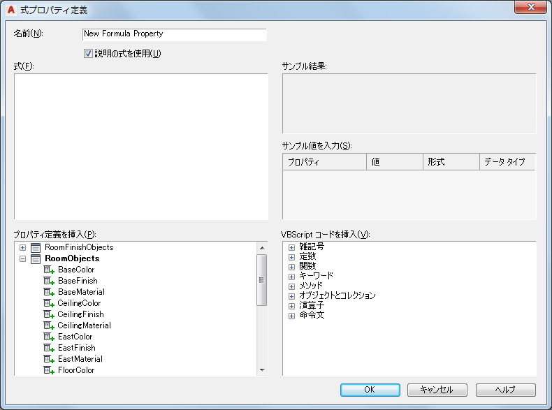 式で使用されるプロパティ定義の名前は、[Width]のように括弧付きで表示されます。 プロパティ定義が、式を含むプロパティ セット定義以外のプロパティ セット定義に属している場合、名前は[DoorObjects:Height]のように表示されます。