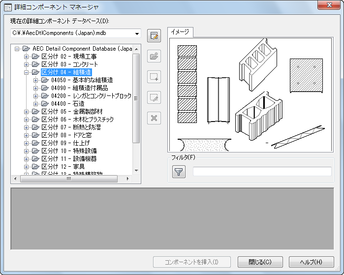 詳細コンポーネント ダイアログ ボックスを使用すると、様々な詳細コンポーネント データベース間を移動することができます。階層ツリー ビューおよびフィルタ機能によって、データベース内の個々のコンポーネントを簡単に見つけることができます。必要なコンポーネントを見つけたら、図面に挿入したり、繰り返し使用するためにツール パレットにドラッグ & ドロップすることもできます。ダイアログ ボックスの中段に縦に配置された 5 つのボタンは、選択したデータベースの編集権限を持っていない場合は、使用できません。