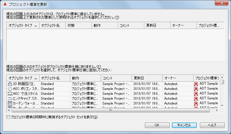 この場合は、[プロジェクト標準仕様の同期中に無視するオブジェクト セットを表示]を選択するか、スタイル マネージャまたは表示マネージャのスタイルや表示設定から[無視する]フラグを削除した場合を除き、スタイルまたは表示設定は以後の同期では表示されません。