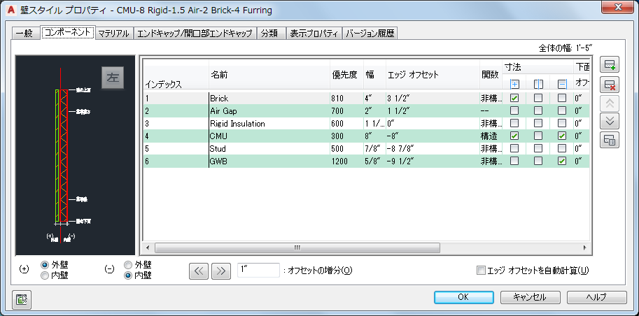 壁スタイルの各コンポーネントは、空洞壁のエアー ギャップなど、壁または壁のマテリアルの構造コンポーネントに対応しています。 壁コンポーネントを作成するときは、次に示すコンポーネントの特性を指定します。