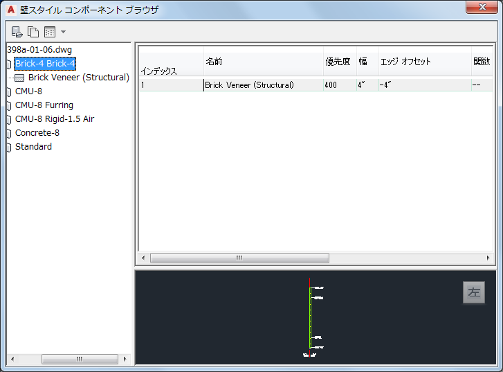 | ブラウザの左ペインのツリー構造 | 壁スタイルを展開して、スタイル内のコンポーネントのリストを表示できます。 左ペインで壁スタイルを選択すると、右ペインでそのコンポーネントのプロパティを表示したり、壁スタイルを確認したりできます。 コンテキスト メニューを使用して、個々のコンポーネントや選択したスタイルのすべてのコンポーネントをコピーすることができます。次に、そのコンポーネントを編集中のスタイルに貼り付けることができます。 |