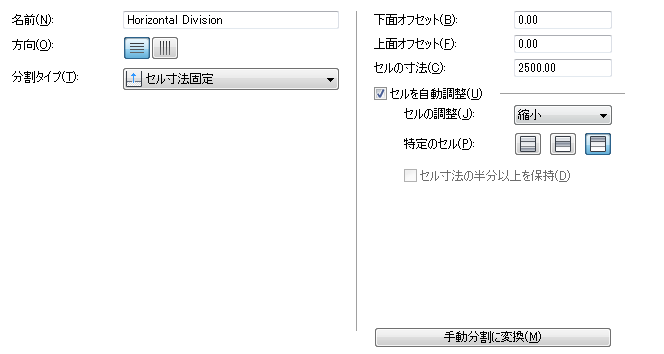 垂直分割を定義している場合、セルの寸法は、マリオンからマリオンまでのセルの長さです。水平分割を定義している場合、セルの寸法はセルの高さです。