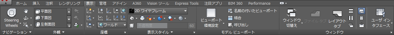 [表示]タブは、ビューを定義および変更し、図面内をナビゲートするための中心的な場所です。