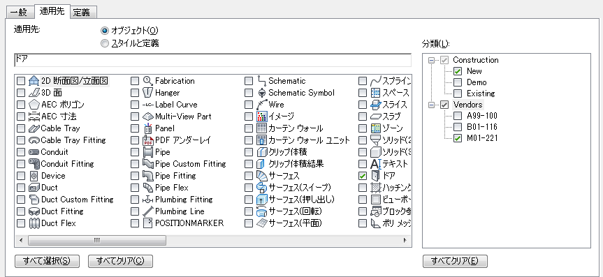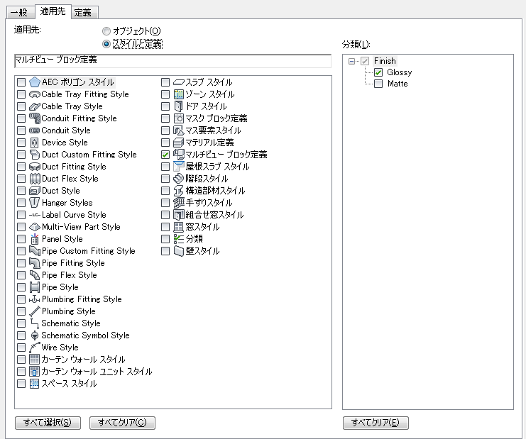 スタイルのすべてのインスタンスで同一の手動プロパティは、スタイル(壁スタイルなど)または定義(マルチビュー ブロック定義など)に適用される、スタイルに基づくプロパティ セット定義に属します。