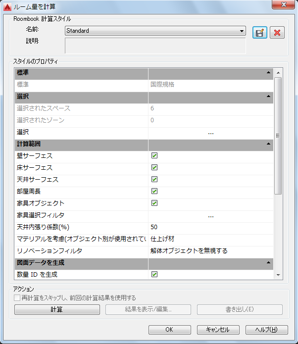 - このダイアログ ボックスで行ったすべての設定(選択、範囲、書き出し)が、現在のルーム量計算のスタイル名で保存されます。ただし、計算設定はスタイル単位ではなく、図面にグローバルに保存されます。計算設定は、新しい計算の前に必要に応じて変更してください。
