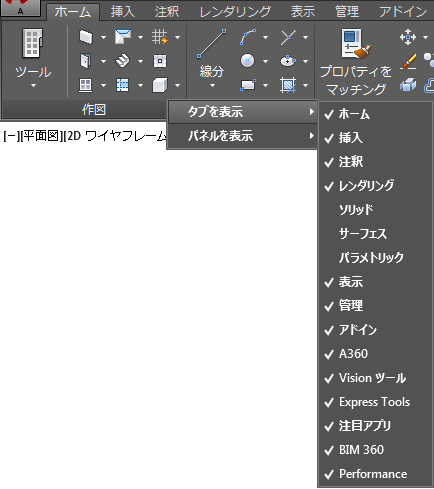 選択されているタブまたはパネル名の横にはチェックマークが表示されます。