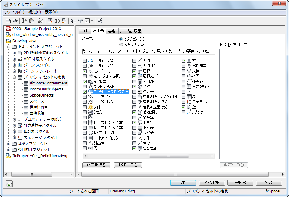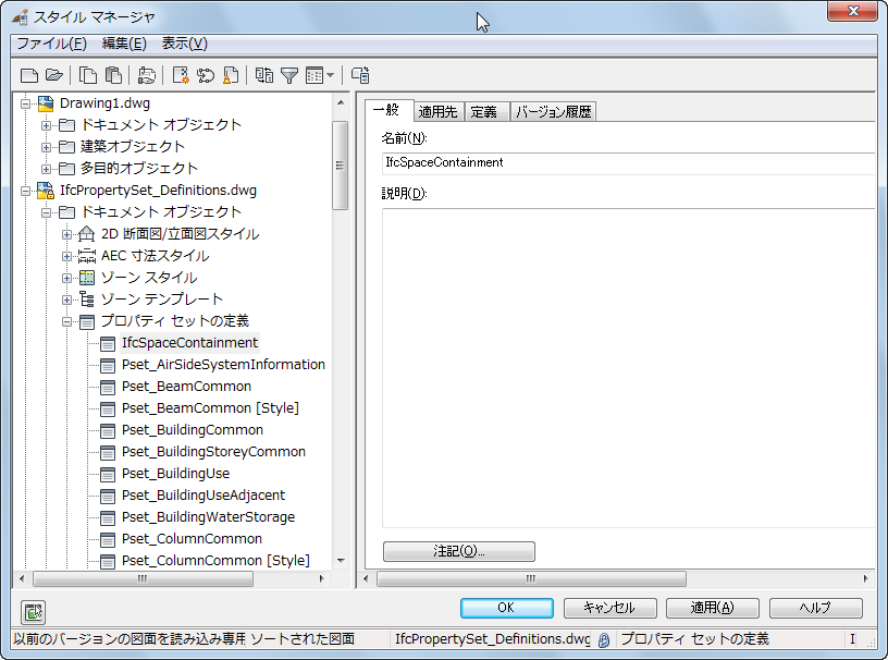 - [スタイル マネージャ]の左ペインで、IfcPropertySet_Definitions.dwg