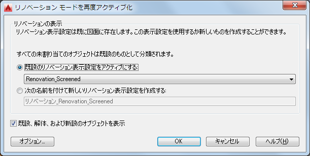 以前にアクティブにした図面でリノベーション モードを再アクティブ化するときは、既存のリノベーション表示設定を使用し続けることも、新しい設定を作成することもできます。