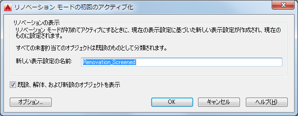 [リノベーション モードの初回のアクティブ化]ダイアログ ボックスが表示されて、既定で新しい表示設定の名前に「リノベーション」という接頭辞が付けられます。