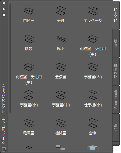 ワークスペースの既定のツール パレットには、スペース ツールが用意されています。そのまま使用することもできますが、必要に応じてカスタマイズすることもできます。 さらに、ソフトウェアに付属している次のカタログには、ツール パレットに追加できるスペース ツールが登録されています。