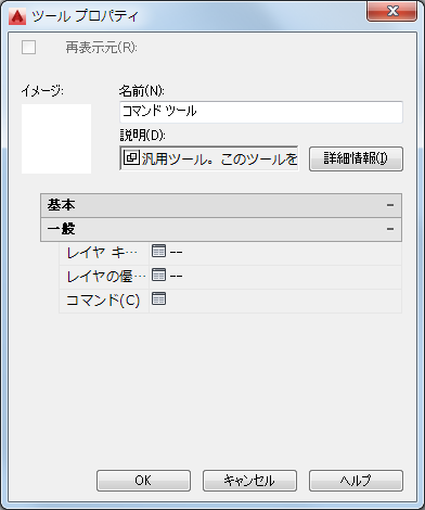 | イメージ | 既定では、コマンド ツールに関連付けられているイメージはありません。ツールの機能を示すイメージを追加するには、空のイメージ領域で右クリックし、イメージを選択します。 |