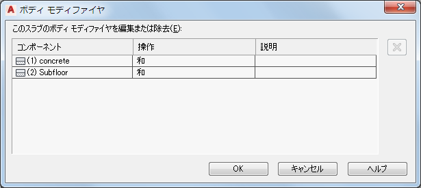 スラブまたは屋根スラブの 3D ボディ モディファイヤを編集または除去するには、次の手順を実行します。ボディ モディファイヤを適用するコンポーネントや、適用方法(選択したコンポーネントに追加、除外、置き換えのどれを実行するか)を変更することができます。また、ボディ モディファイヤの説明を入力または編集することも可能です。
