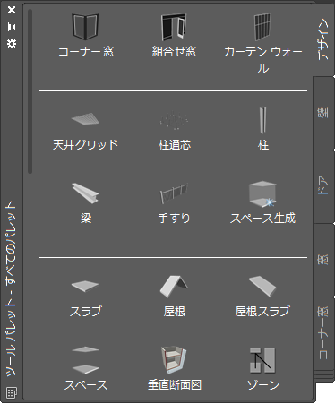 ワークスペースの既定のツール パレットには、実用的で、必要に応じてカスタマイズできる屋根ツールのサンプルが含まれています。 また、ソフトウェアに付属している次のカタログには、ツール パレットに追加できる屋根ツールが含まれています。