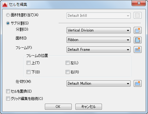 分割、面材、フレームで選択したセルを分割するには [サブ分割]を選択します。